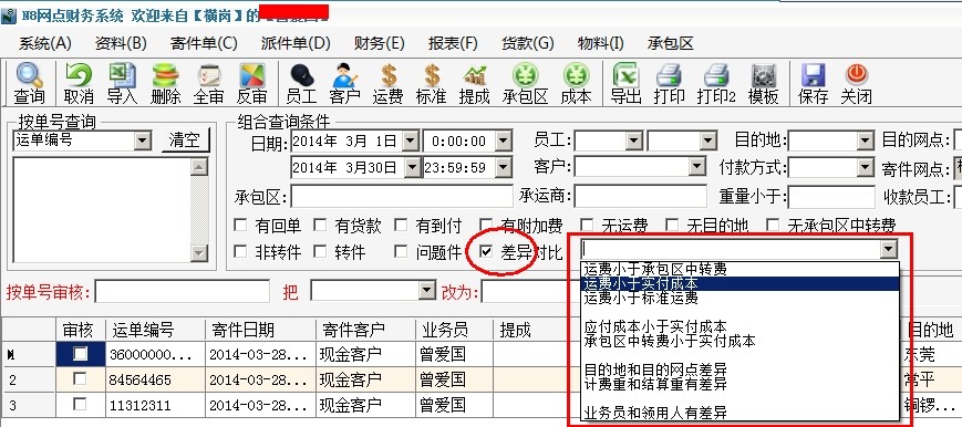 打開F8系統(tǒng)"寄件單-->寄件單審核"界面,你會看到有一個"差異對比"勾選框。右邊的選取框里可以選擇要對比的項(xiàng)目: