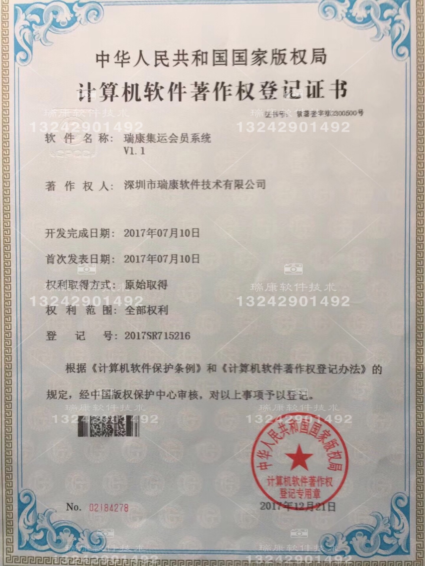 根據《計算機軟件保護條例》和《計算機軟件著作權登記辦法》的規定和中華人民共和國國家版權局的考證,日前,“瑞康科技”再次榮獲計算機軟件著作權登記證書。