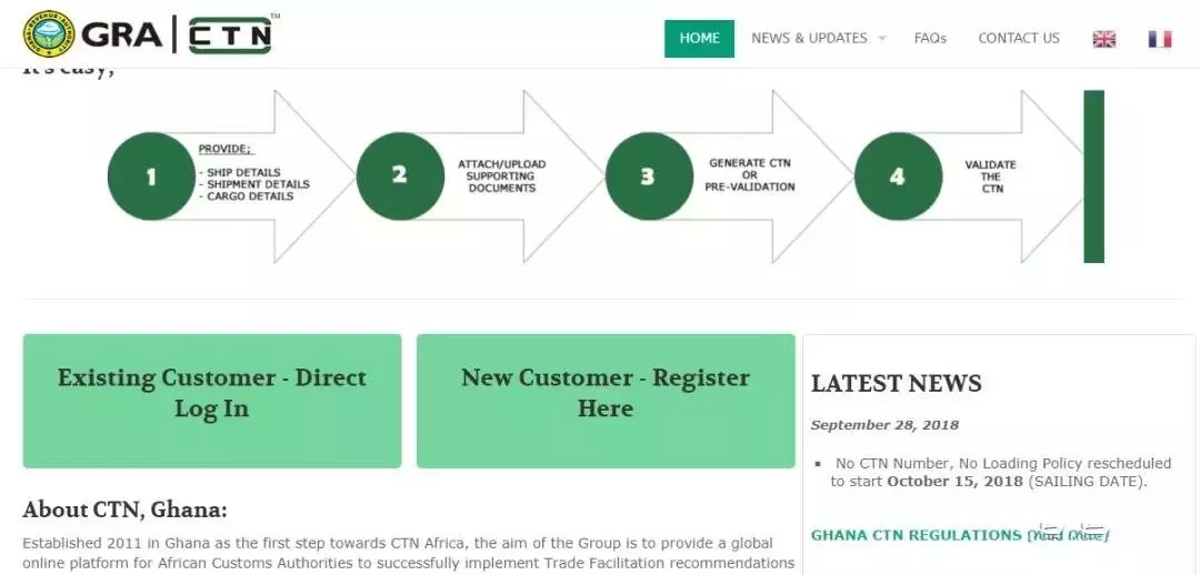發(fā)貨人/承運(yùn)人需在官網(wǎng)https://www.ctnghana.com/上傳以下文件:商業(yè)發(fā)票、出口報關(guān)單掃描件(符合要求的報關(guān)預(yù)錄單也可以)、裝箱單,24-36個小時內(nèi)會得到一個未生效的CTN號碼。