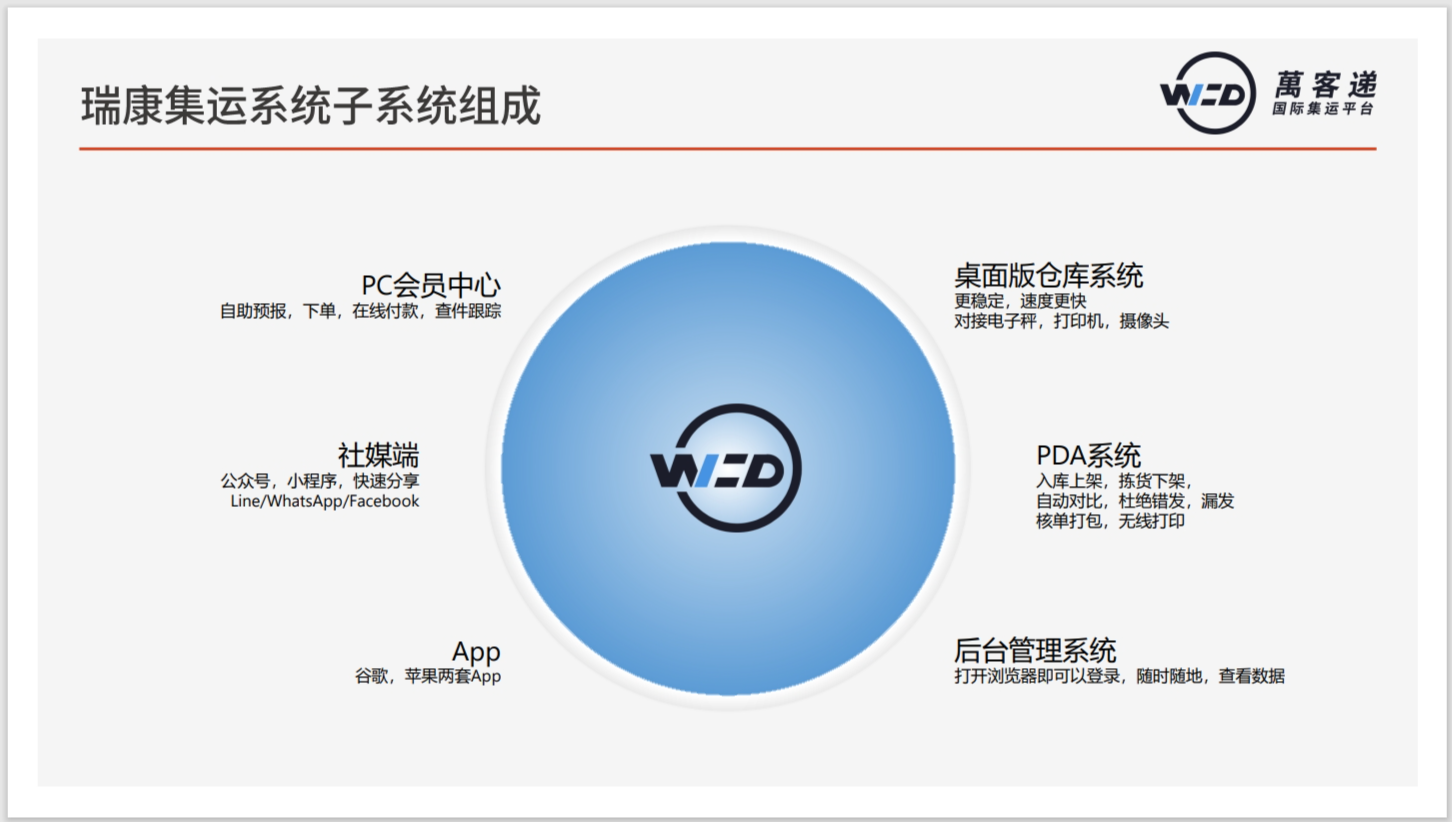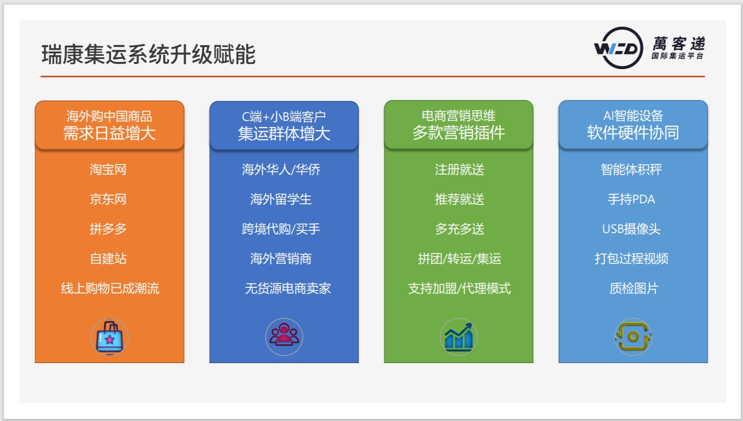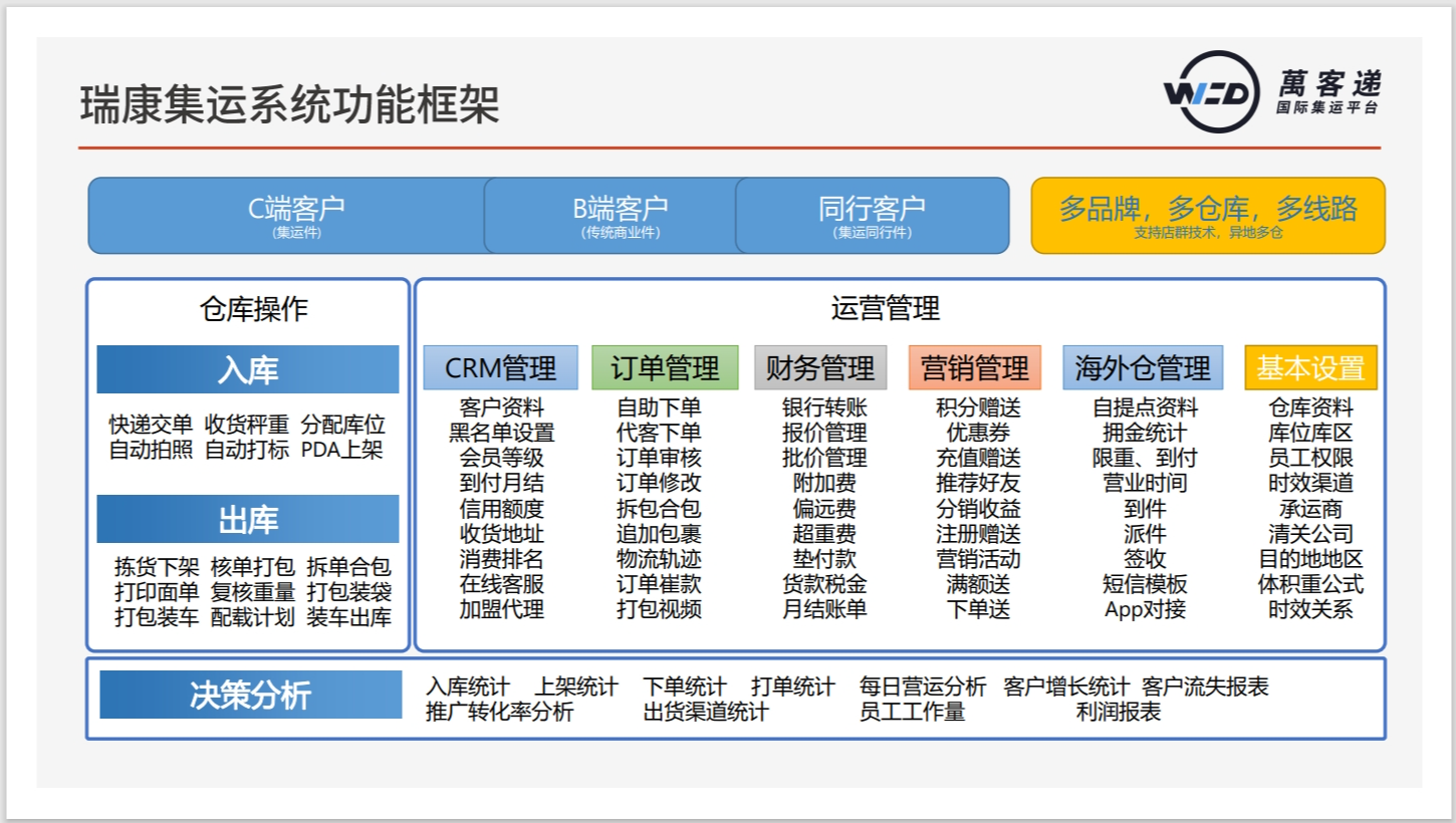 瑞康集運系統(tǒng)是專門為跨境集運服務(wù)商設(shè)計研發(fā)的集訂單管理、會員管理、財務(wù)管理、倉儲管理為一體的信息化系統(tǒng)。